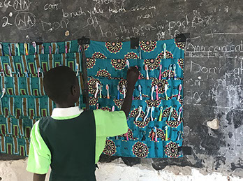 We hebben lesmateriaal ontwikkeld, waarmee de leerkrachten zelf aan de slag kunnen. Om te starten krijgen scholen tandpasta, tandenborstels, zeep, jerrycans en teilen. Elke leerling krijgt een eigen tandenborstel. De tandenborstels worden op school bewaard in een speciaal gemaakt ‘wandkleed’ met opbergvakjes.